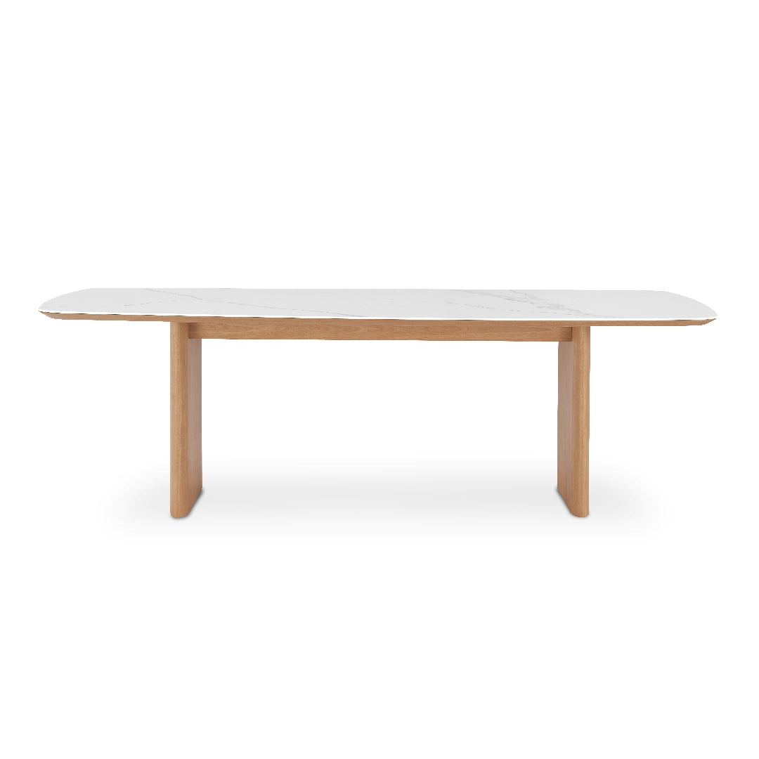 The Stanza Dining Table 2000 combines a large, modern oak-coloured base with a pristine white stone top, offering a refined balance of natural warmth and contemporary elegance. Its generous size ensures ample space for family meals or entertaining guests, while the durable stone surface provides both style and long-lasting functionality. Ideal for sophisticated dining areas seeking a statement piece that merges classic craftsmanship with modern design principles.