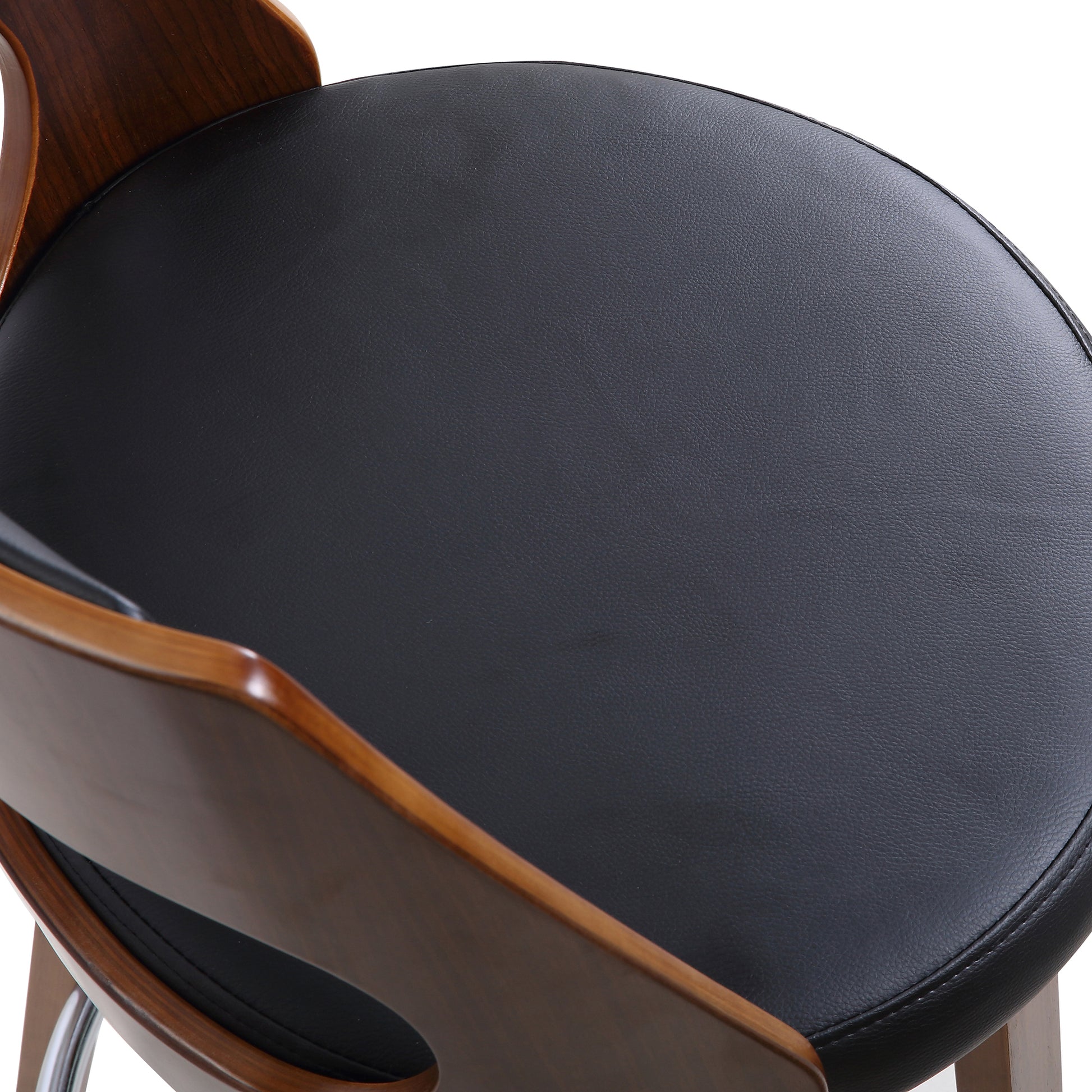 Elevate your space with the Oslo Walnut and Black Bar Stool, crafted from rich solid walnut timber for lasting strength and natural beauty. Its sleek black PU leather seat offers comfortable support, while the polished silver ring adds a modern touch. Designed with a smooth swivel function, this stool combines style and practicality, making it perfect for kitchens, bars, or dining areas where both elegance and functionality matter.